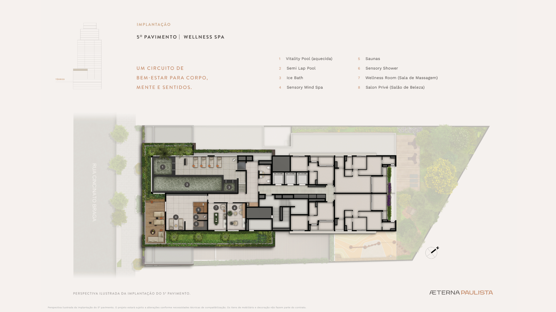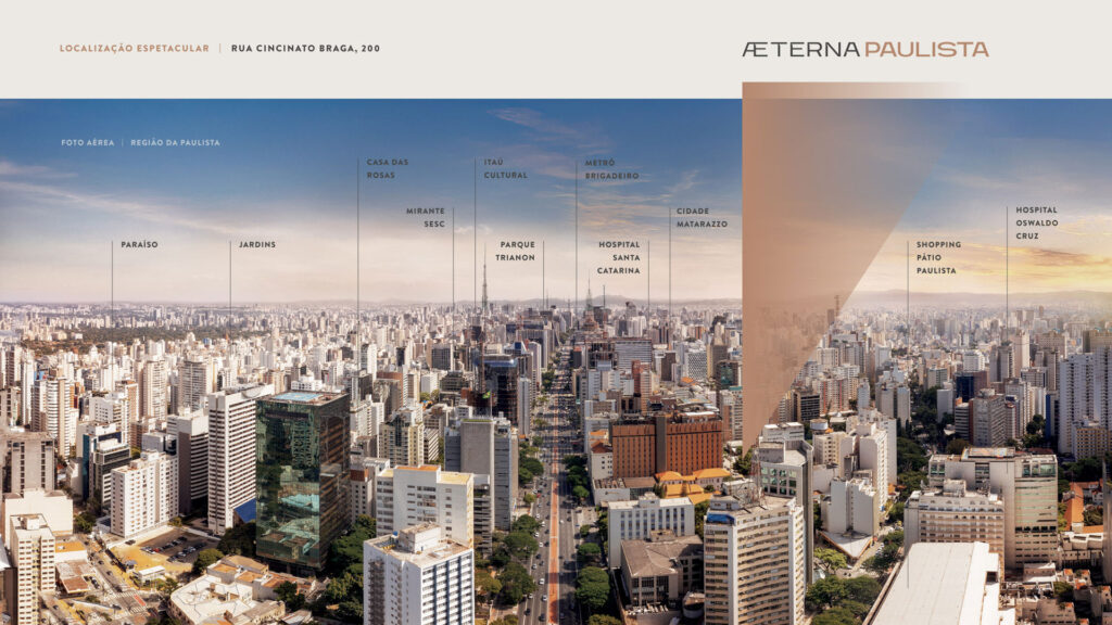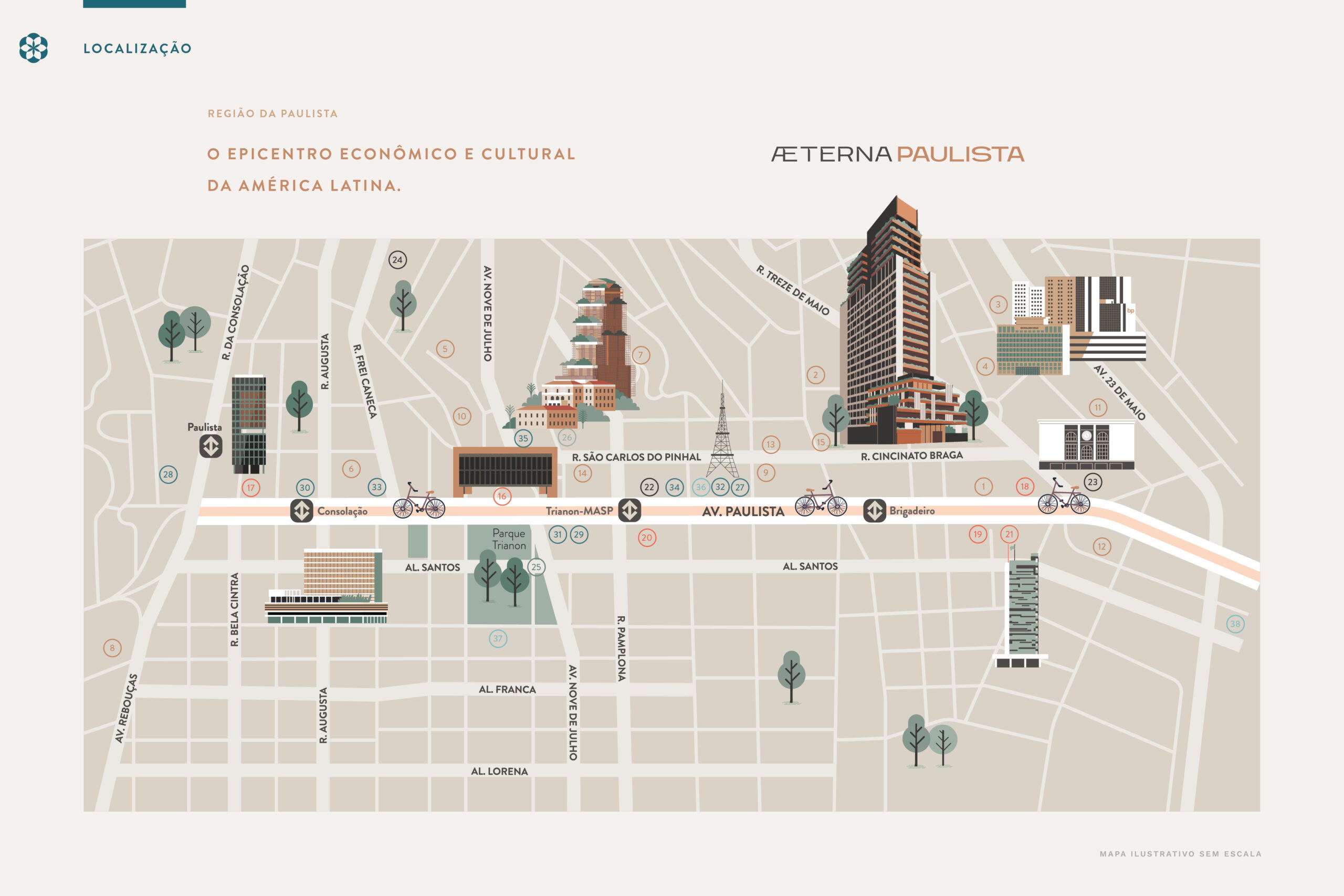 Edifício AETERNA Paulista – Incorporadora: Cincinato08 SPE Empreendimento Imobiliário Ltda. Incorporação registrada em 26/03/2025 sob nº R. 03, matrícula n° 210.589, no 4° Cartório de Registro de Imóveis de São Paulo/SP. Alvará de aprovação de edificação nova n° 34231-23-SP_ALV e Apostilado, processo SEI 1020.2023/0024166-7, publicado em 16/12/2024. Imagens ilustrativas, sem escala e sujeitas a alterações. Projeto executivo em desenvolvimento. As medidas das plantas indicam distâncias face a face entre paredes. Móveis e utensílios são sugestões de decoração. O empreendimento e suas áreas serão entregues conforme Memorial Descritivo e projetos executivos. A vegetação e o paisagismo são ilustrativos e apresentam árvores em porte adulto de referência. Na entrega do empreendimento, a vegetação poderá apresentar diferenças de tamanho e porte. Intermediação: Zero Oito Consultoria Imobiliária Ltda. – CRECI/SP Nº 042169-J. Importante: valores de corretagem pagos diretamente pelo comprador ao corretor/imobiliária, sem acréscimo ao valor ofertado.