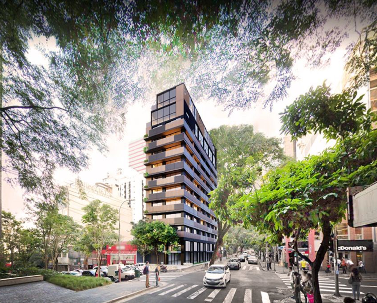 Com volumetria marcada por quatro blocos sobrepostos, a torre abriga teatro, café, escritórios e unidades comerciais com terraços, unindo arquitetura contemporânea, funcionalidade e integração com a cidade.